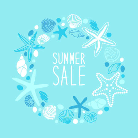 手でかわいいビンテージ フレーム描画貝殻とヒトデや手書きのテキスト夏のセール のイラスト素材 ベクタ Image